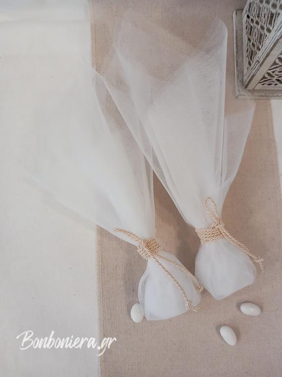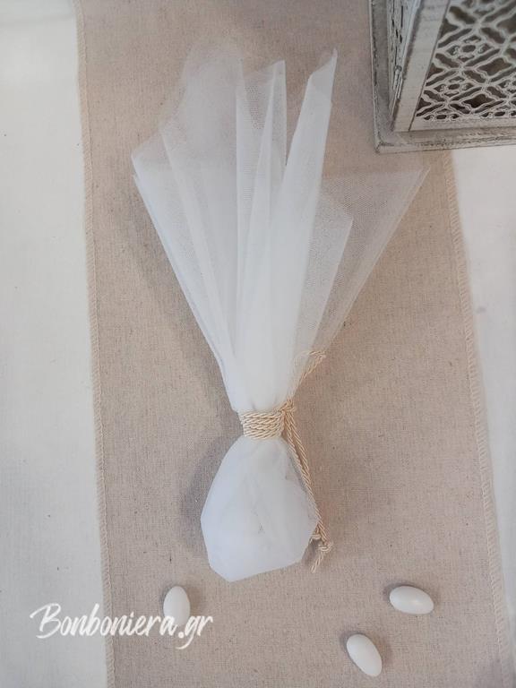 Δημιουργήστε με στυλ τη μέρα του γάμου σας με την κομψή Μπομπονιέρα Γάμου με Κορδόνι. Φτιαγμένη από διπλό γαλλικό τούλι, προσφέρει μια διαχρονική και εκλεπτυσμένη εμφάνιση. Το τούλι διατίθεται και σε εκρού χρώμα, ενώ το κορδόνι μπορεί να επιλεγεί σε οποιαδήποτε απόχρωση ταιριάζει στο ύφος της δικής σας ξεχωριστής ημέρας.