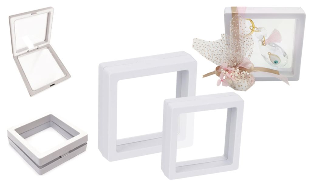 Πρωτότυπο κουτί επίδειξης με διάφανη, ελαστική μεμβράνη που συγκρατεί το αντικείμενο στο εσωτερικό του, δημιουργώντας εντυπωσιακή παρουσίαση. Ιδανικό για δημιουργία ξεχωριστής μπομπονιέρας γάμου ή βάπτισης.