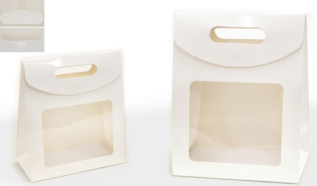 Κομψή λευκή τσάντα με διάφανο παράθυρο και γυαλιστερή πλαστικοποιημένη επιφάνεια, ιδανική για συσκευασία δώρου ή δημιουργία εντυπωσιακής μπομπονιέρας.